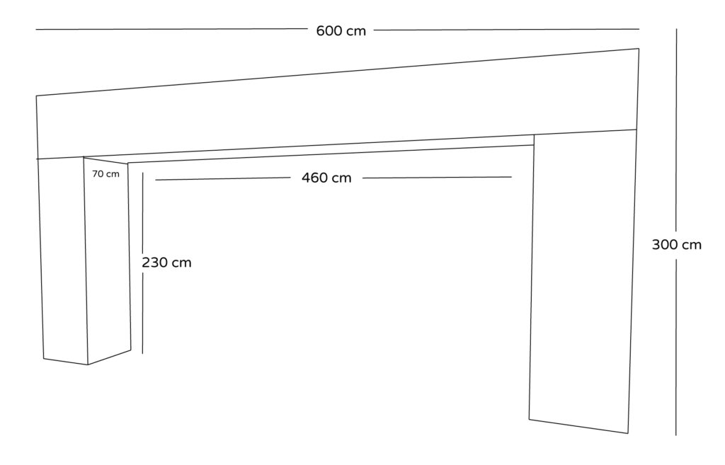 Pilaren: 70 x 230 cm (4 per pilaar) Bovendeel: 600 x 70 cm (3 of 4 stuks, bovenzijde is optioneel) Zijkanten bovendeel: 70 x 70 cm (2 stuks)